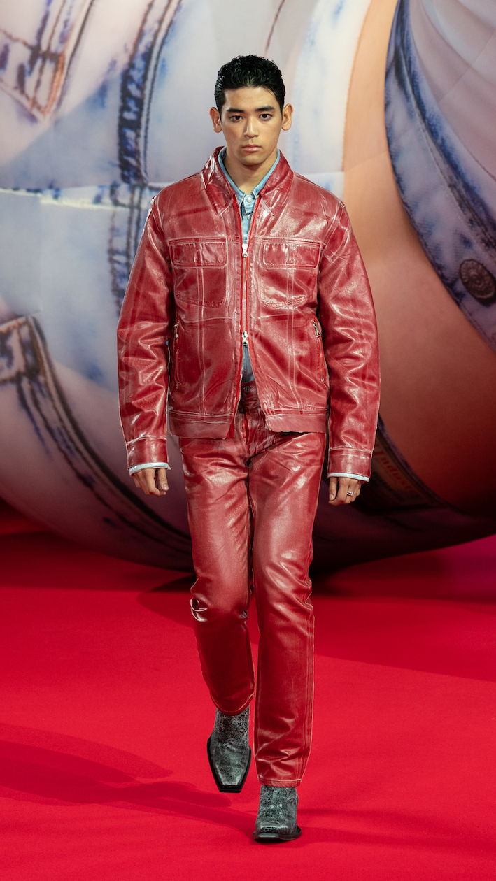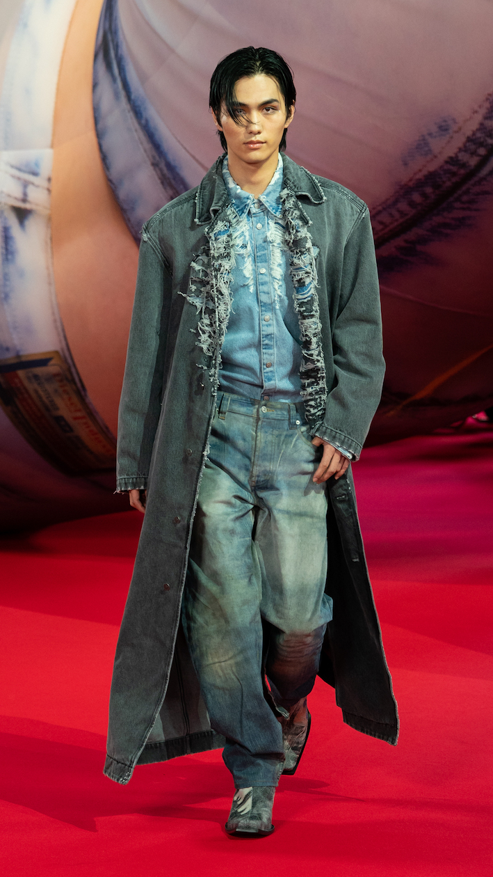 日本のショーために用意された6つのレッドルックを含む、総勢61人のルックがラインナップされたコレクションは、デニム、ユーティリティ、ポップ、職人技の4つのチャプターで構成。素材がぶつかり合ってコントラストを生み、テクスチャーが強調されたすべてのアイテムはブランドのDNAである、破壊的かつセクシー、そして流動的な楽しさが表現された。