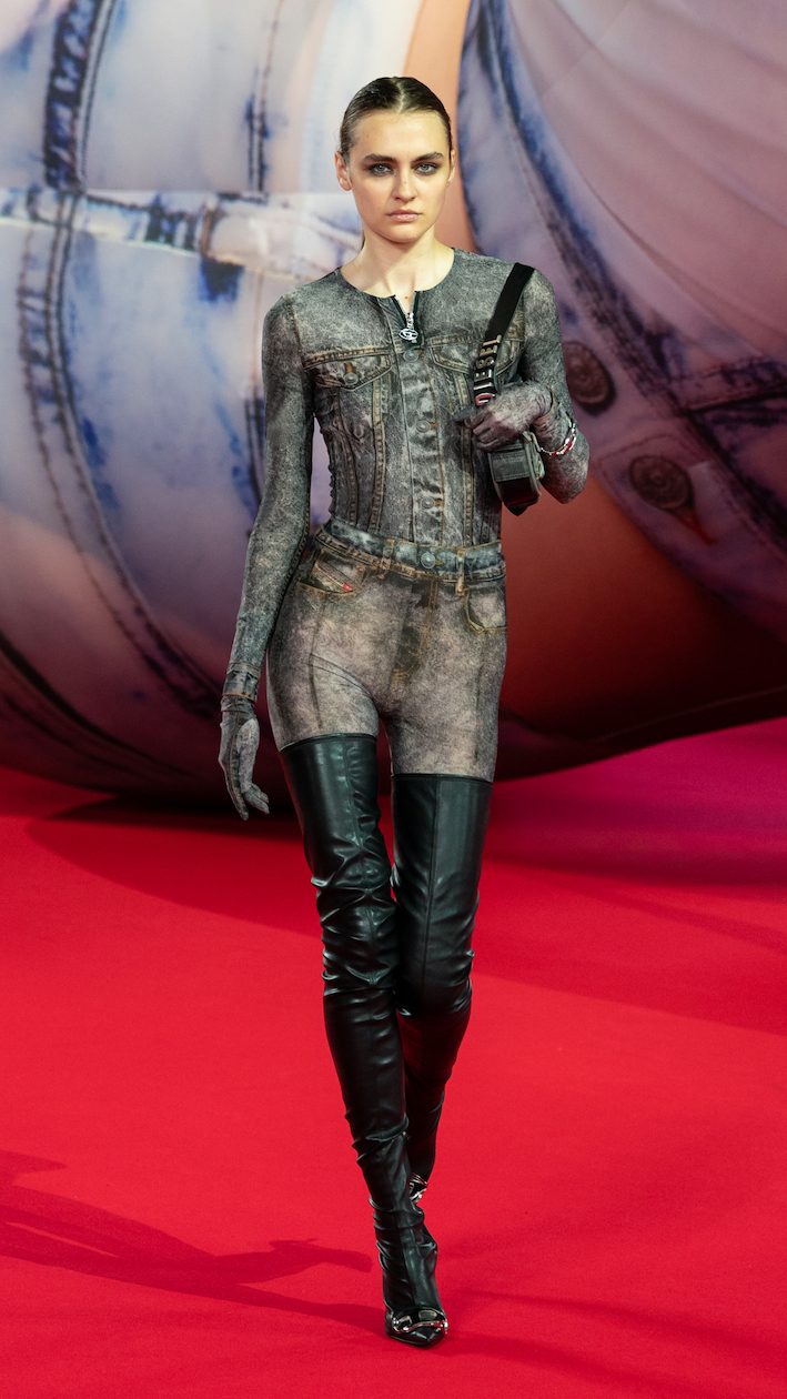 アイテムは、ブランドの中核をなす「ディーゼル ライブラリー」で構成されたデニムや、胸元に「D」ロゴがあしらわれたメタリックピンクのドレス、アップサイクル・ジャージーをデニムに接着した職人技「ピールオフ」ピース、オーガンジーをアップサイクルしスモッキングで仕上げた軽快なミニドレスなど、多様なアイテムを展開。